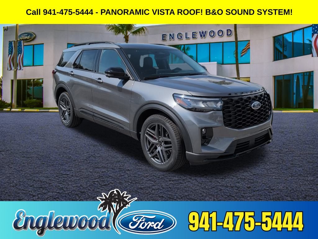 2025 Ford Explorer PANORAMIC VISTA ROOF!, B&O SOUND SYSTEM!, 10 Speakers, 3rd Row seats: bench, ABS brakes, Air Conditioning, Apple CarPlay/Android Auto, Auto-dimming door mirrors, Auto-dimming Rear-View mirror, Automatic temperature control, B&O Sound System by Bang & Olufsen, Bumpers: body-color, Compass, Driver door bin, Electronic Stability Control, Emergency communication system: 911 Assist, Equipment Group 400A Standard Package, Exterior Parking Camera Rear, Front Bucket Seats, Front Center Armrest, Front dual zone A/C, Front fog lights, Fully automatic headlights, Garage door transmitter, Heated door mirrors, Heated front seats, Heated rear seats, Heated steering wheel, Heated/Ventilated Miko Sport Captain’s Chairs, Illuminated entry, Leather steering wheel, Memory seat, Multicontour Seats w/Front Active Motion, Navigation System, Outside temperature display, Overhead console, Panoramic Vista Roof w/Power Shade, Passenger vanity mirror, Power driver seat, Power Liftgate, Power passenger seat, Power steering, Power windows, Rear air conditioning, Remote keyless entry, Security system, Speed control, Sport steering wheel, Steering wheel mounted audio controls, Sun and Sound Package, Telescoping steering wheel, Tilt steering wheel, Traction control, Variably intermittent wipers, Ventilated front seats, Wheels: 21″ Magnetite-Painted Aluminum. ST 4WD 10-Speed Automatic